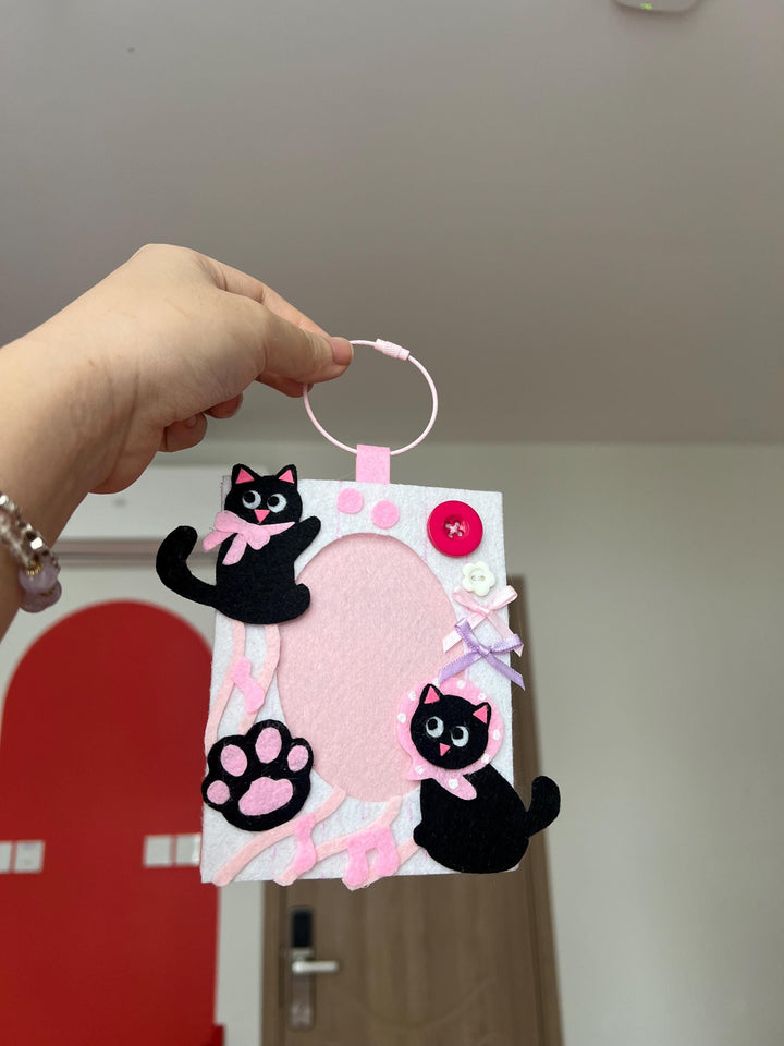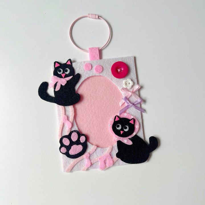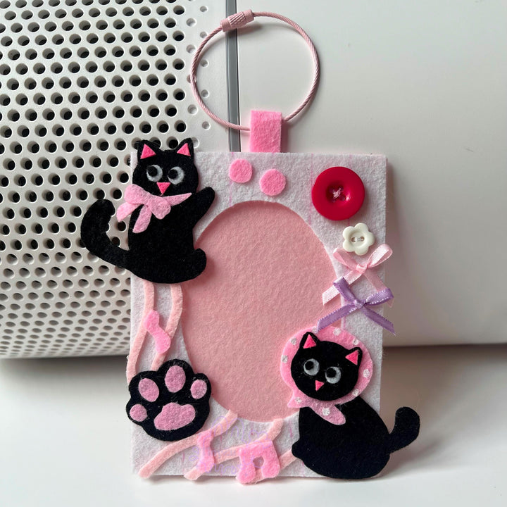 Card Holder Keychain – Handmade Felt Photo Frame with Pink-Toned Black Cat Design