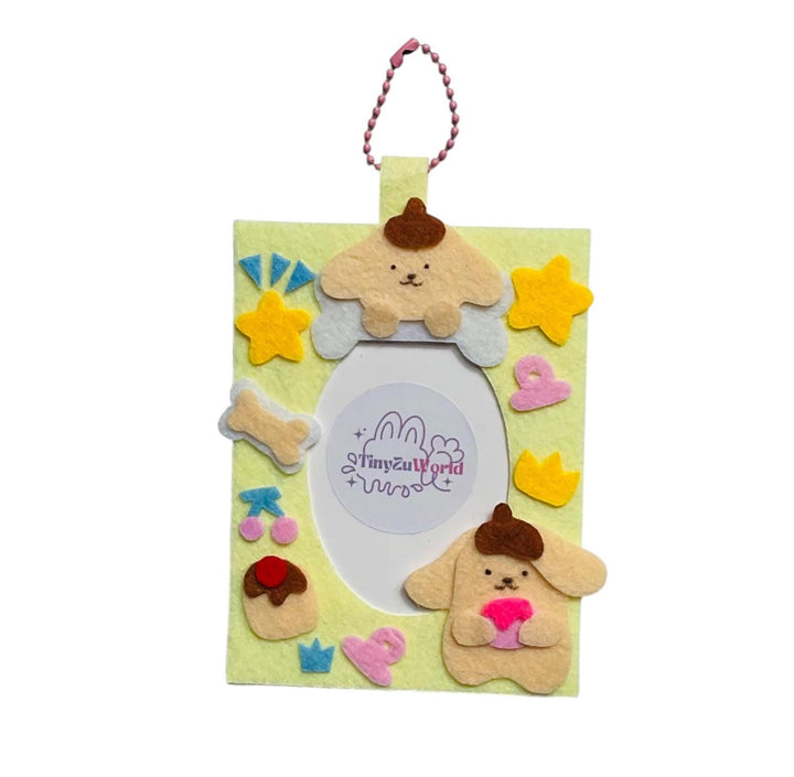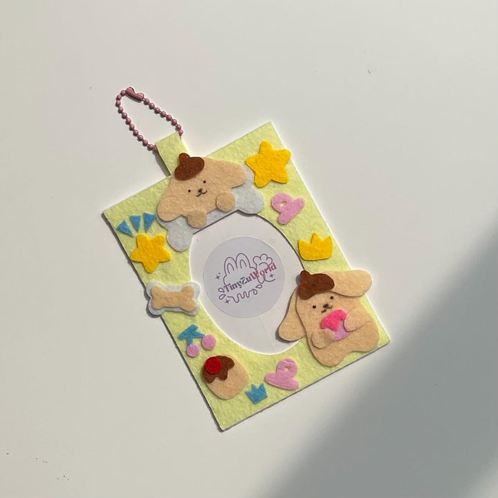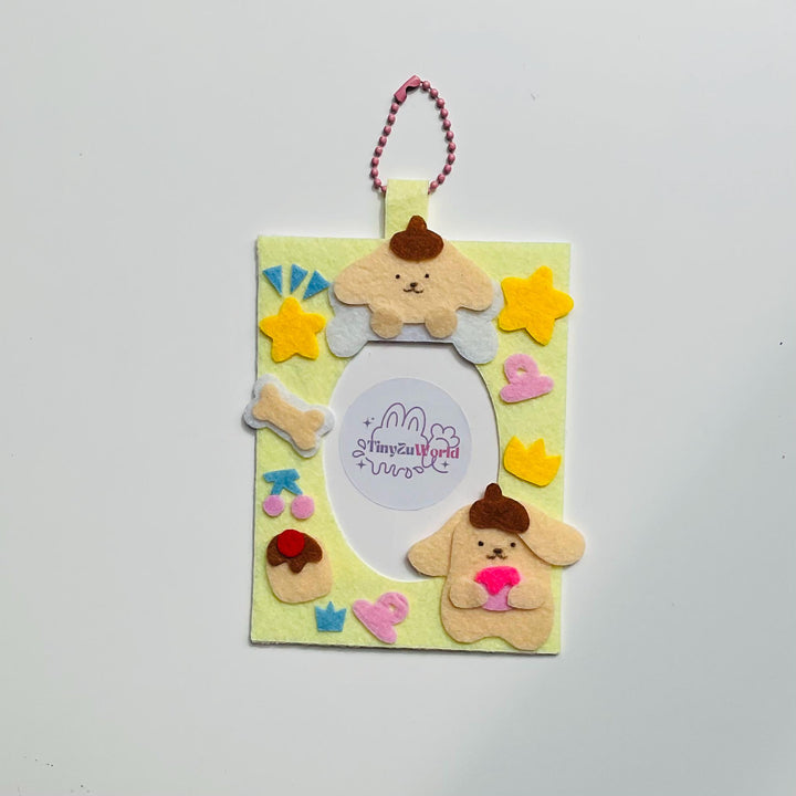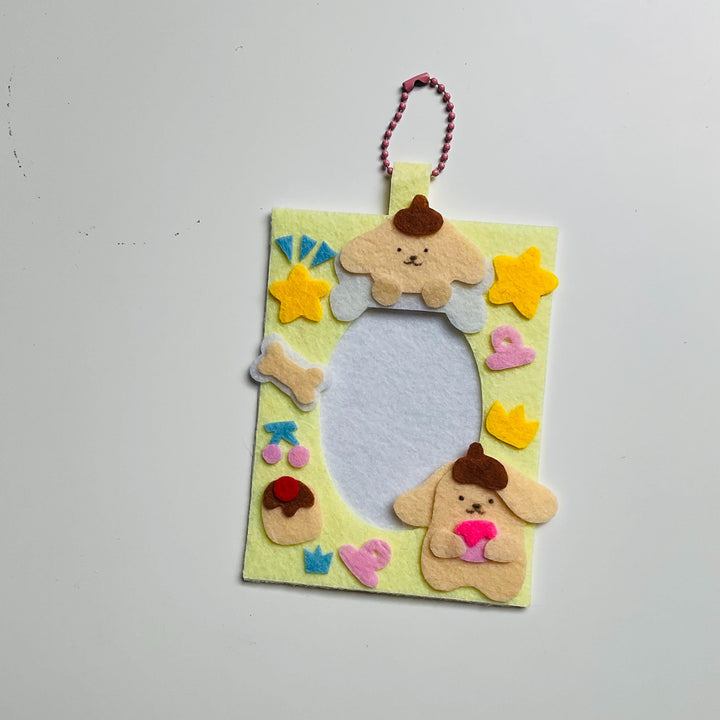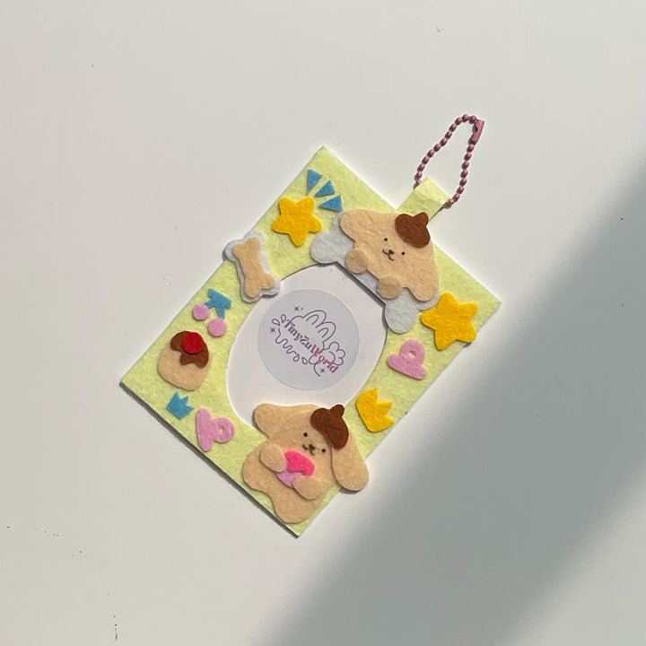 This handmade cardholder is crafted from hard felt, featuring adorable dog characters and colorful decorations like stars, hearts, sweets, and bones.