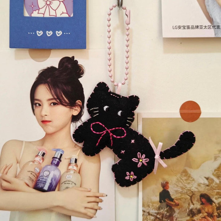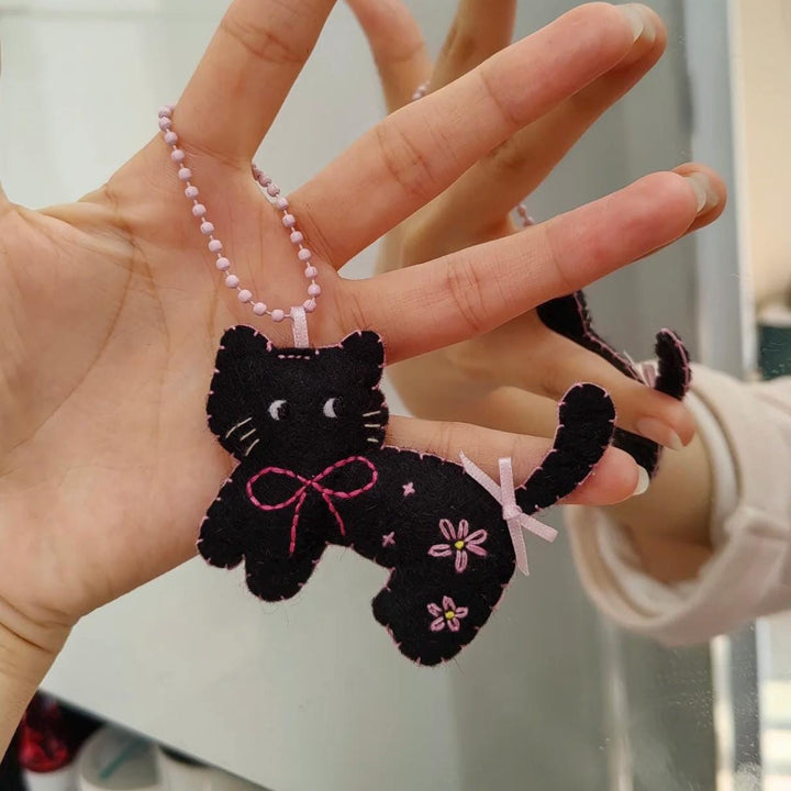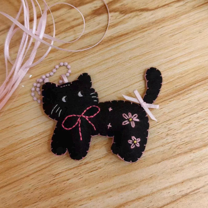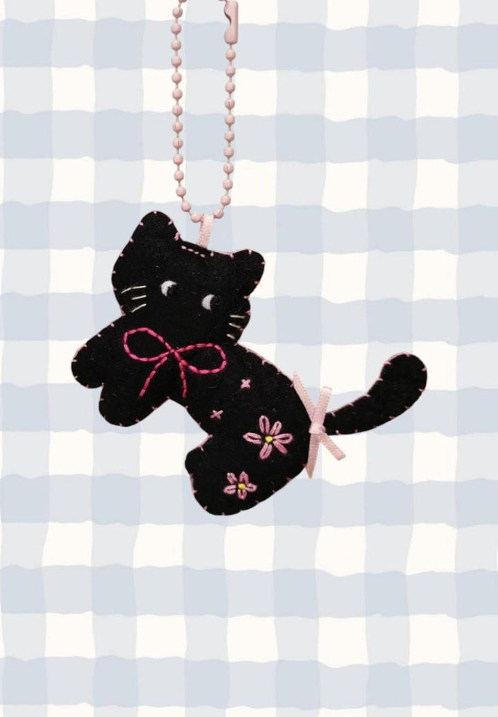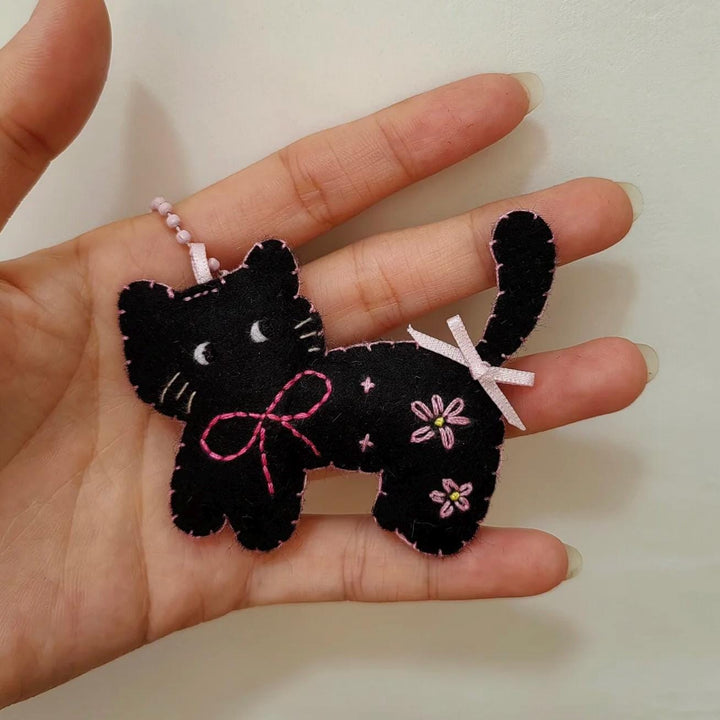 Lovingly crafted from soft felt, this adorable kitty is decorated with delicate pink embroidery, a bow, and floral details that make it truly unique. Its lightweight design makes it perfect for accessorizing your keys, purses, or backpacks, while also being a thoughtful gift for any cat lover.