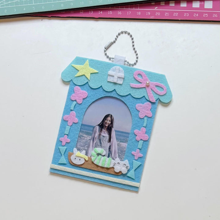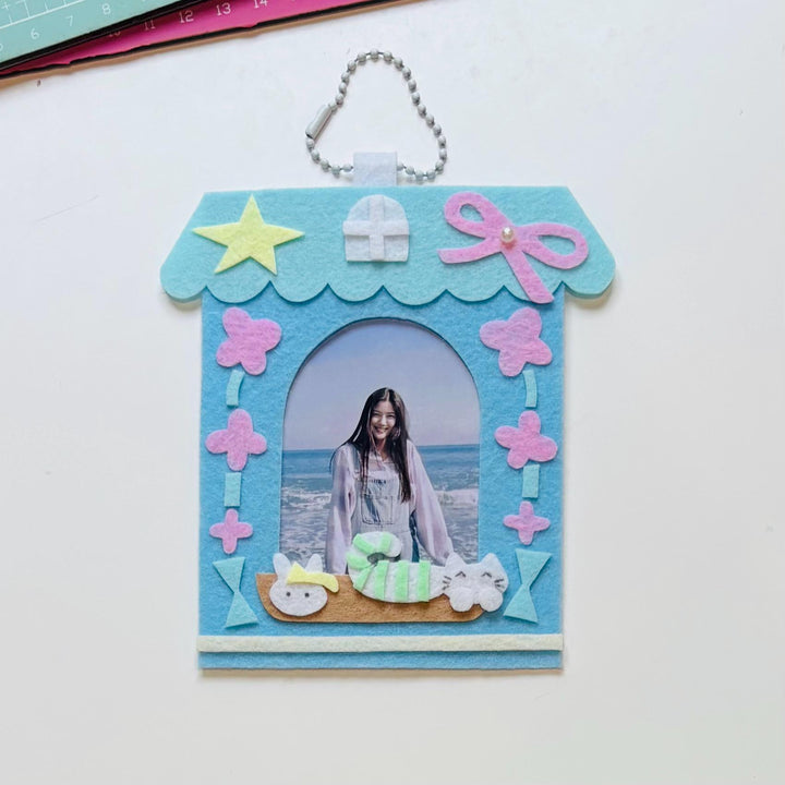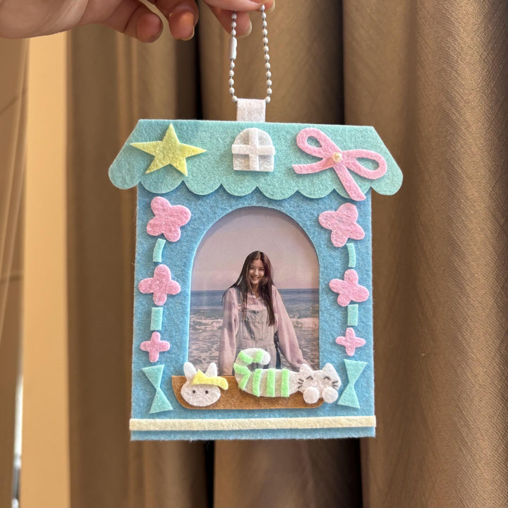 Turn your favorite moments into adorable keepsakes with this handmade felt card holder! Designed in the shape of a pastel blue house, itβs decorated with sweet details like ribbons, stars, and cute animals, making it the perfect way to display your K-pop photocards, Polaroids, or mini prints.