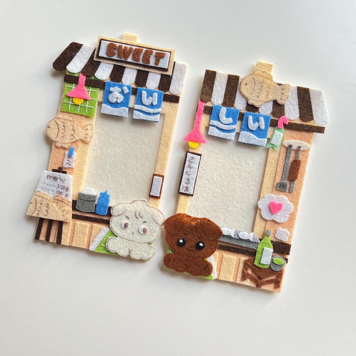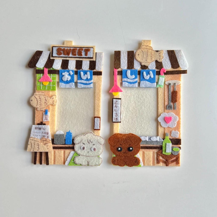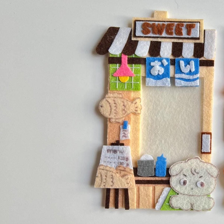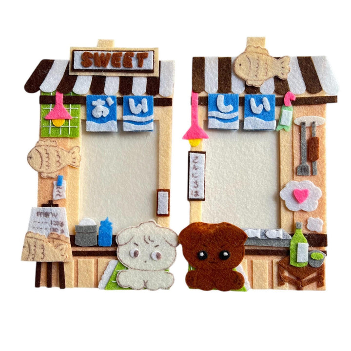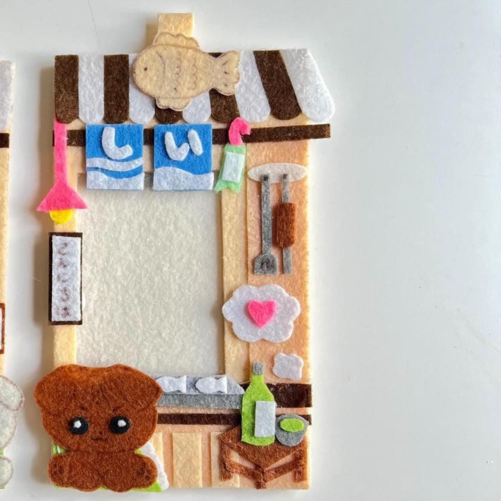 Step into a cozy Japanese street food stall with this handmade felt cardholder, inspired by a traditional taiyaki (fish-shaped cake) stand. This adorable design features striped awnings, colorful hanging lanterns, and two sweet little animal characters waiting to enjoy their treats! The felt is carefully layered to create a charming 3D storefront scene full of delightful tiny details—from the fish signs to the soft drink bottles and cooking tools.