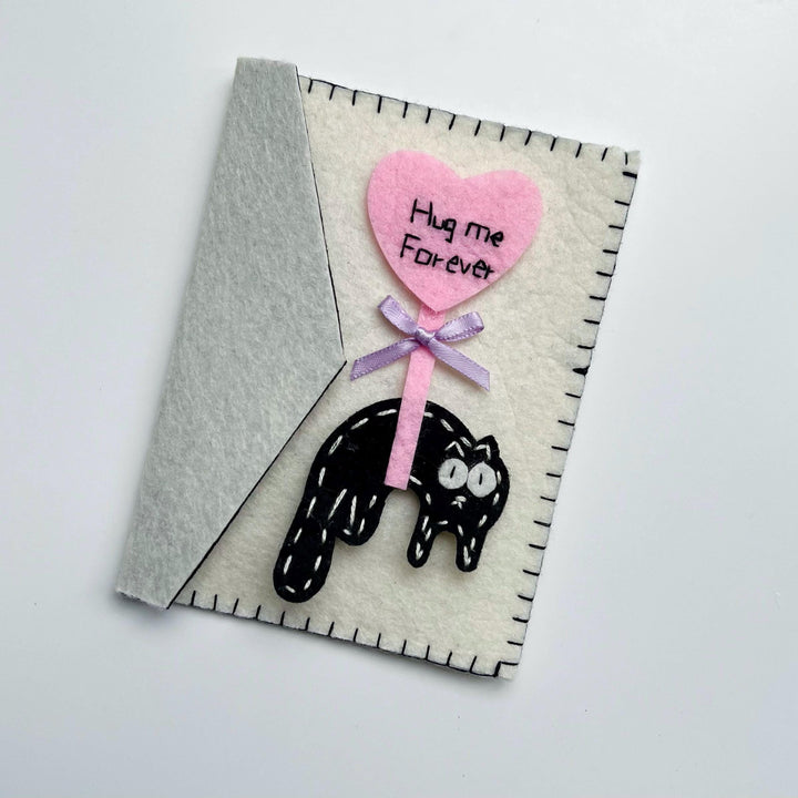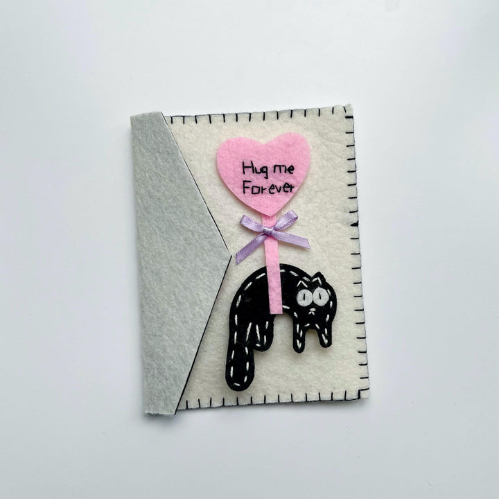 Handmade Felt Greeting Card Holder – Cute Cat Design – Birthday Gift Pouch – “Hug Me Forever” Theme