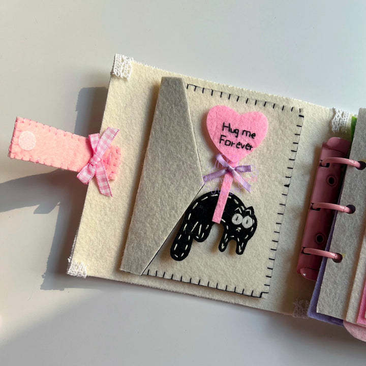 Crafted with love from high-quality felt, this charming pouch features a playful black cat holding a pink heart that reads “Hug me forever”, complete with a tiny lavender bow. The soft, stitched design and cozy pastel tones make it a delightful keepsake for anyone who appreciates handmade charm.