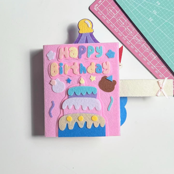 🎂 Birthday-themed decorations with colorful felt characters and cute embellishments