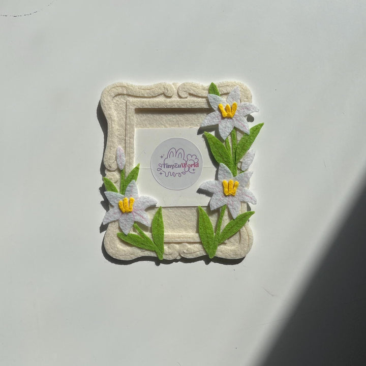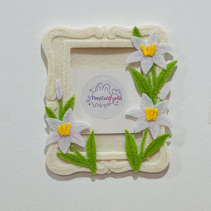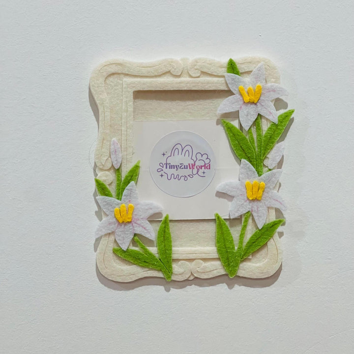 This fully handmade cardholder is crafted from hard felt, featuring a classic cream-colored frame adorned with pure white lily flowers.
